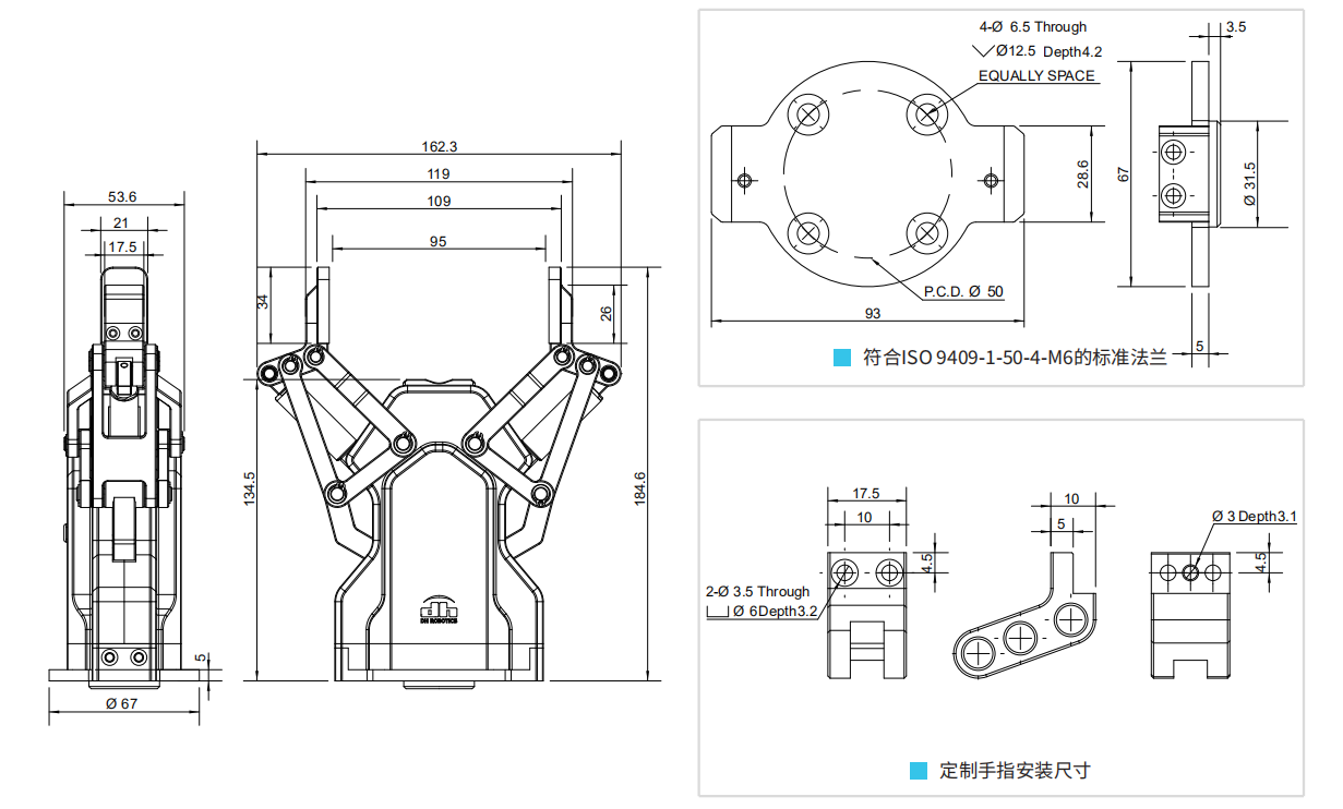 5. 一體化設計集成:夾爪一體化集成電機、連桿機構、驅動控制系統,結構緊湊體積小,防護等級高。
