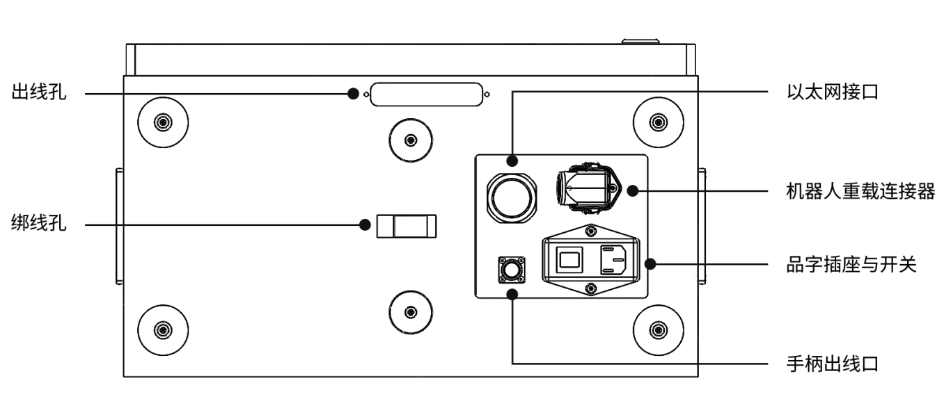 電控柜底面板包括出線孔、綁線孔、手柄出線口,以及以太網接口、機器人重載連接器、品字插座與開關等,其中出線孔和綁線孔可用于布置和固定通往機器人前面板的線束。以太網接口用于將機器人連接至本地網絡。品字插頭與開關用于電源連接,機器人重載連接器用于連接電控柜與機器人本體。