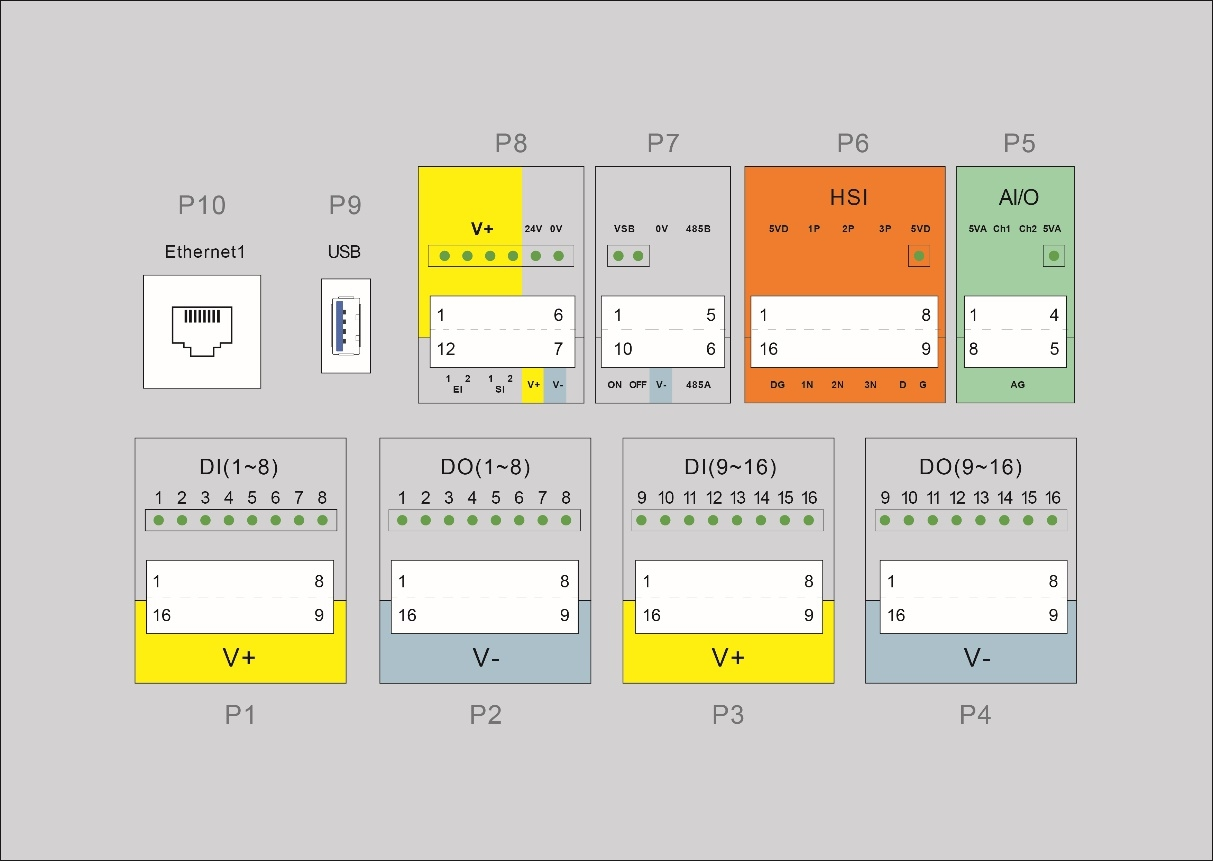 電控柜前面板接口布置在電控柜門打開后的第一層,包括 16 個數字輸入(P1 與 P3)、16 個數字輸出(P2與 P4)、兩個可配置模擬量接口(P5)、一組高速接口(P6)、遠程開關機與 485 接口(P7)、安全功能(P8)、USB3.0 接口(P9)與以太網接口(P10),USB 接口與以太網接口保留為內部使用。