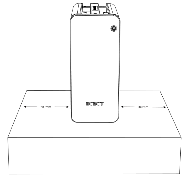 請將控制柜放置在越疆CR3機械臂工作空間外的水平臺面,并預留足夠的線纜接線空間和操作空間??刂乒癜惭b空間要求如下圖所示,左右需預留200mm的空間,出風口無堵塞,保證足夠的散熱空間。