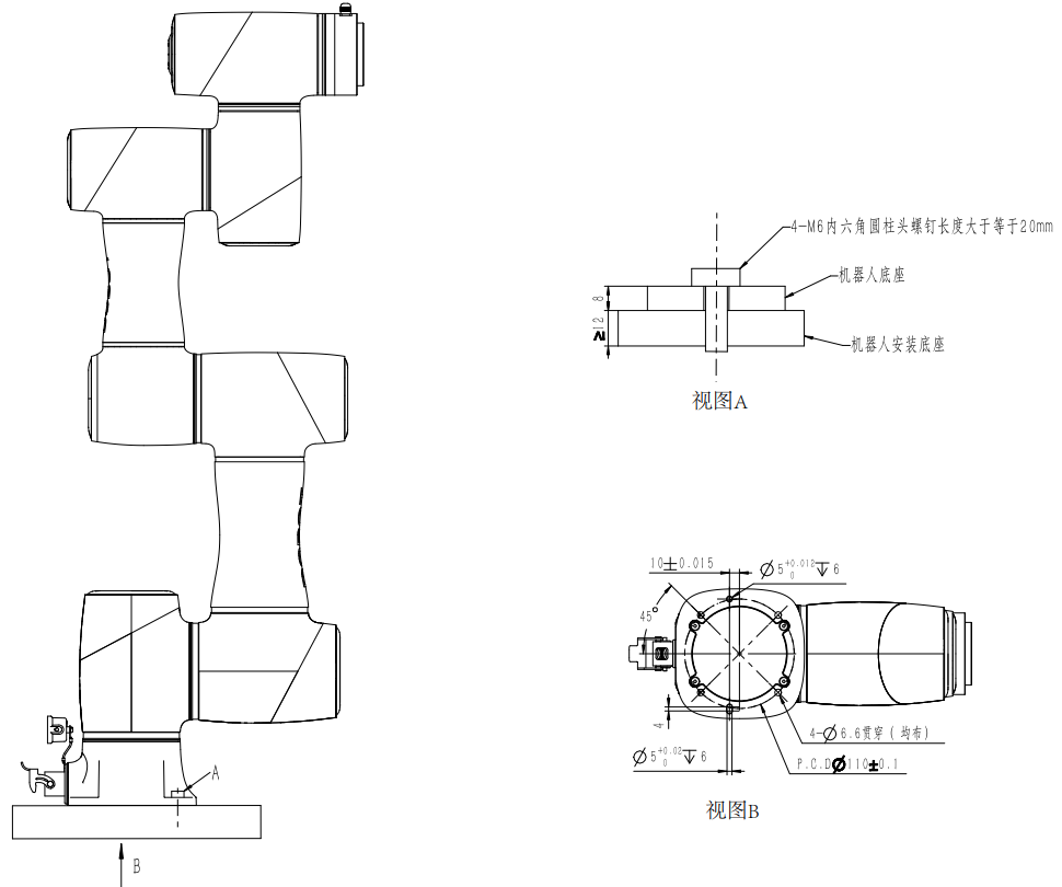 機械臂的安裝直接影響機械臂運行的穩(wěn)定性。用戶在固定機械臂時可根據(jù)機械臂底座孔位尺寸以及真實環(huán)境自行設計選擇安裝臺架,且機械臂的安裝高度需要在0.6米以上。機械臂的固定臺架不僅需承受機械臂的重量,還需承受最大加速度運動時的動態(tài)作用力。將機械臂固定在臺架上時需注意: