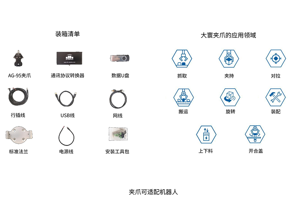 大寰AG-95關節型自適應電爪最大負載達3kg,重復定位精度為0.03mm,單側抓持力為45~160N。夾爪有效行程達到95mm, 可以適應大小不同的物體。適用于多個協作/工業機器人適用行業,如機械加工、汽車、電子等。 ?