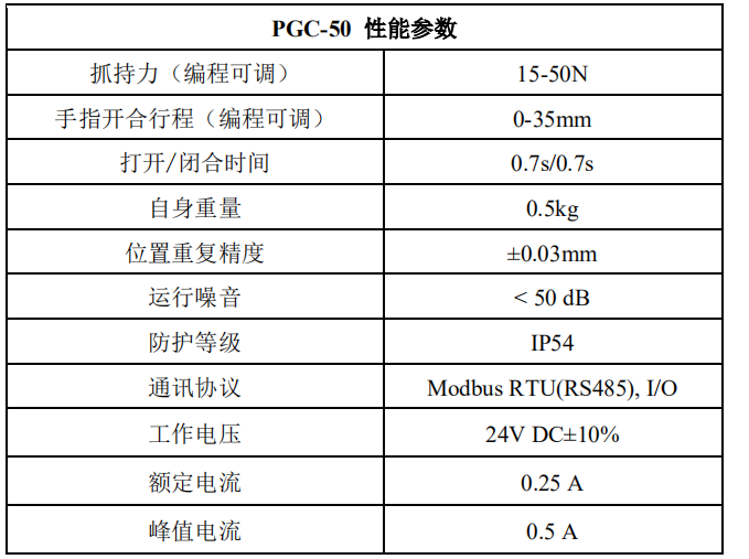 PGC-50 夾爪為協作型平行夾爪,具有精準力控、體積小、多種安裝方式、指尖可定制、抓取掉落反饋、驅控一體等特點。