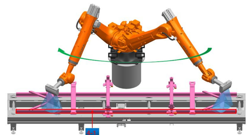 通過機器人引導3D視覺設備拍攝汽車廠滑橇上的檢測工位:4個接車頂點相對中心位置(檢測精度±1mm),4個穿梭機鎖緊孔相對中心位置(檢測精度±1mm),4個鎖緊孔感應塊相對高度(檢測精度±1mm),2條縱梁水平度Z,直線度Y(檢測精度±3mm),完成汽車滑橇自動化質量檢測功能。
