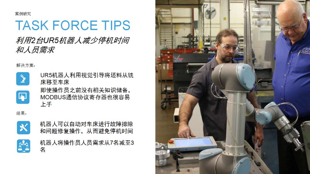 3、優傲機械臂的導入能夠替代原來照管機器人的工人,從這些崗位上轉移出來的人力可以從事有更高附加值的工作。同時,也降低了人手操作機床的危險系數。