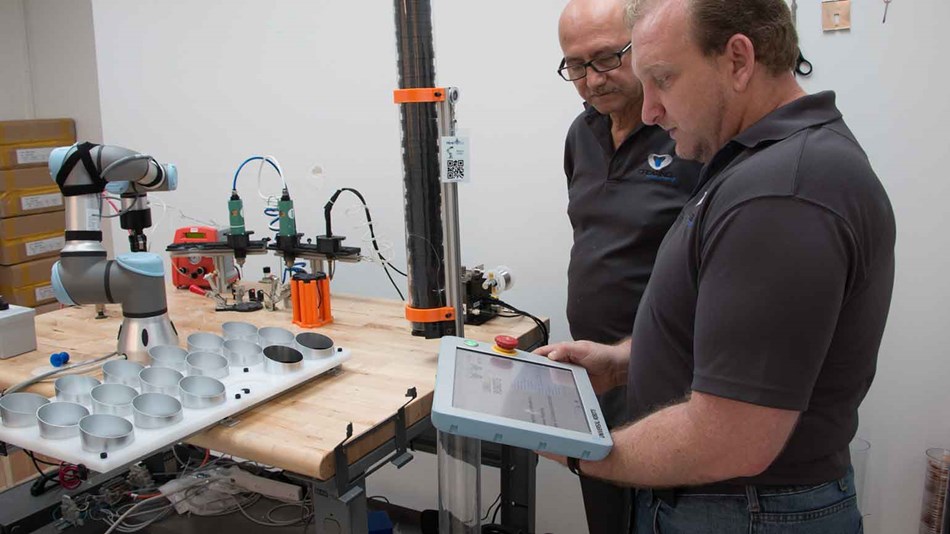 UR3 負(fù)責(zé)處理兩道工序:首先,機(jī)器人檢查鋁殼部件在托盤上的排列是否正確。然后,機(jī)器人拾取零件,放入夾具,拿起硅膠注射器,沿著鋁殼內(nèi)緣注入硅膠。接著,在上面放上一塊丙烯酸圓盤,再把組裝好的零件放回托盤。下一步是鉆孔和焊接:機(jī)器人從分配器中取出一個(gè)帶有銅基座的圓盤,將其放在光學(xué)激光傳感器中,對準(zhǔn)圓盤。然后,將圓盤放在固定架中,閉合兩個(gè)夾鉗將其固定。
