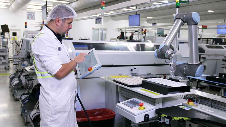 公司目前使用四個(gè)優(yōu)傲協(xié)作式機(jī)器人將引入部件安裝到電路板中,由于封裝或部件本身的尺寸較大,傳統(tǒng)的自動(dòng)機(jī)器無(wú)法操作這些部件;而 UR10、UR5和UR5e 協(xié)作式機(jī)器人可以利用經(jīng)認(rèn)證的 OnRobot UR+ RG2 協(xié)作式夾具實(shí)現(xiàn)這一操作 -直接從供應(yīng)商包裝中拾取單個(gè)部件,例如接頭或引入部件。然后將部件安裝到傳送帶上的電路板上,傳送帶也是生產(chǎn)線的一部分。