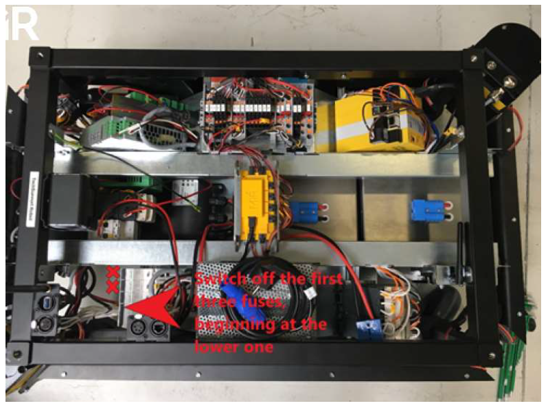 2. 關閉電池相關的保險絲。如圖,三個保險絲,從圖片最下面一個保險絲開始關閉。