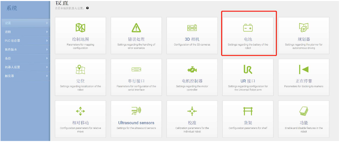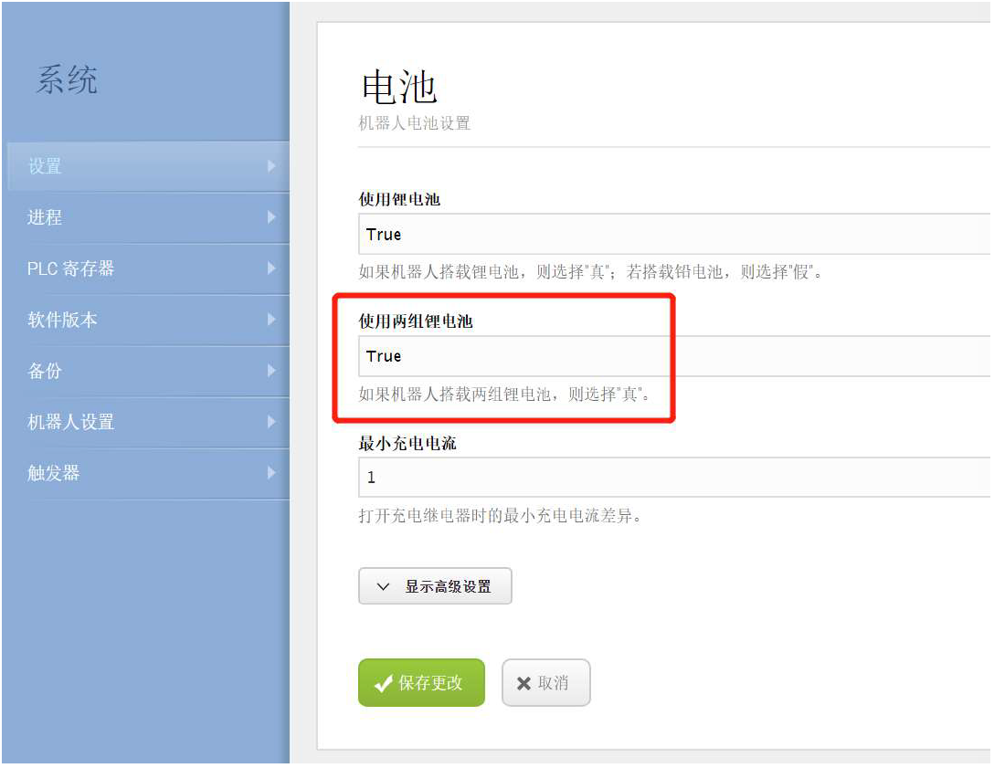在MiR機器人操作界面“系統>設置>電池”選項內設置使用兩組鋰電池為:true, 并保存更改。