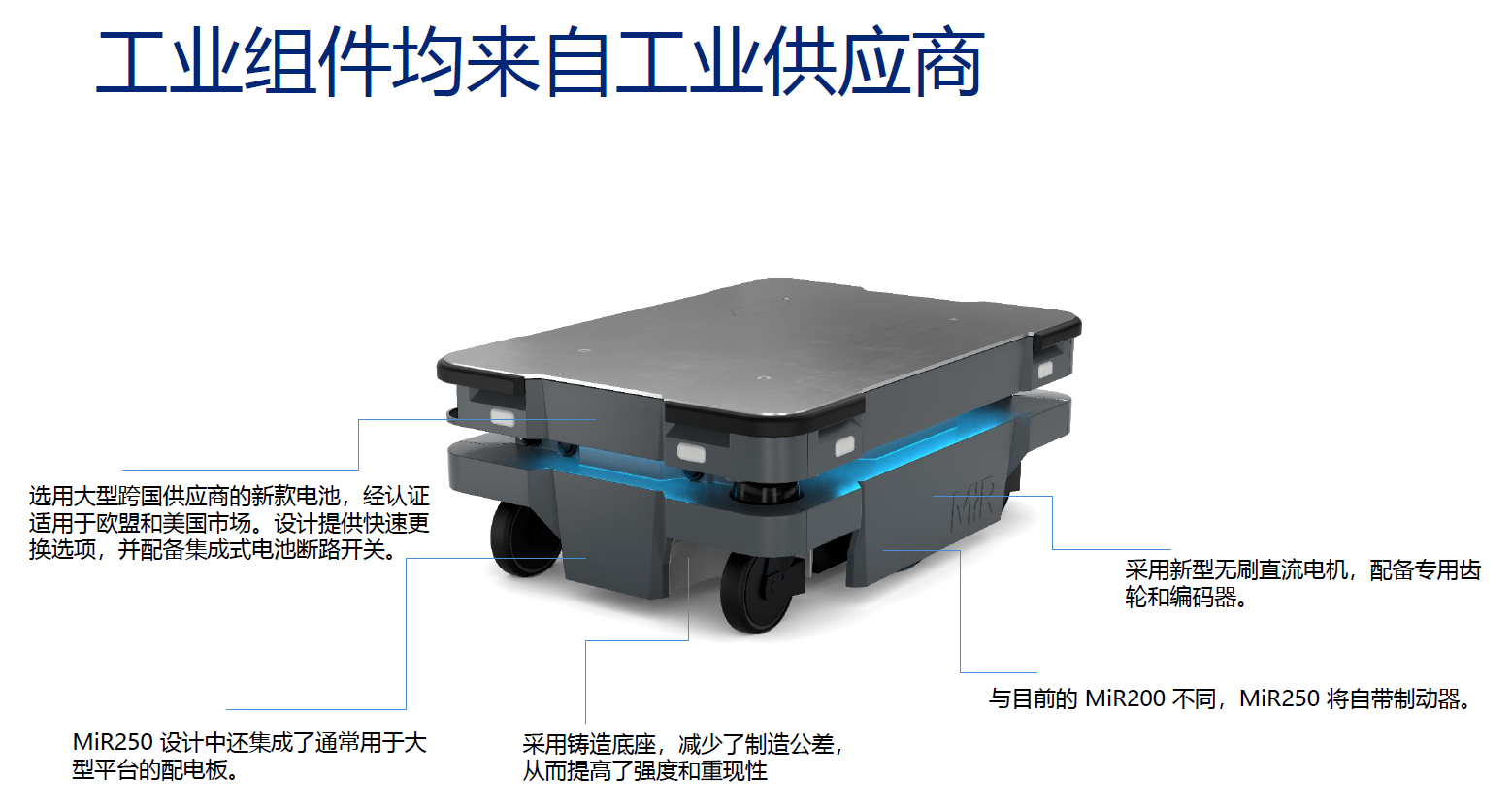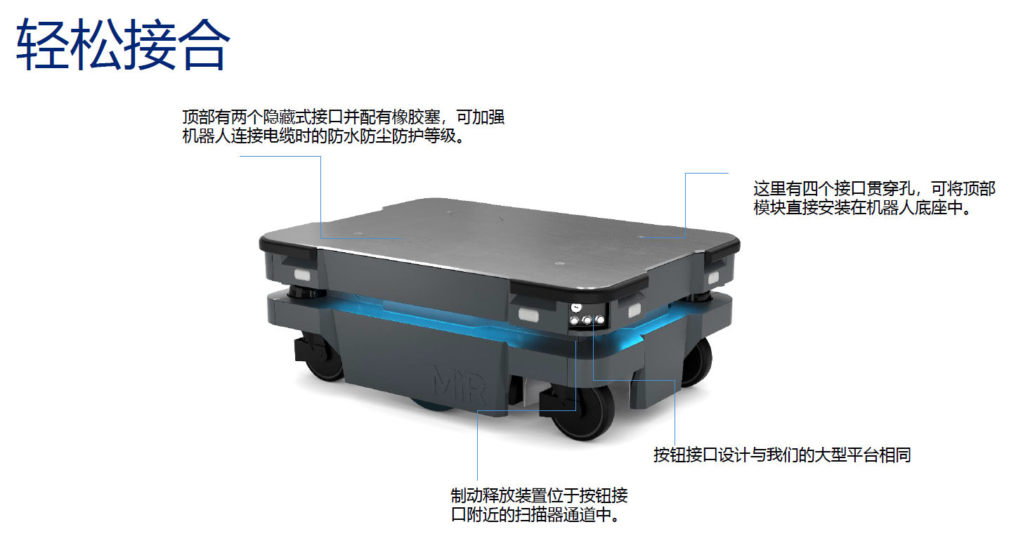 MiR根據很多應用場景的分析,將產品做成標準化,客戶只需要在MiR一次性購買產品組合,即MiR250底盤加上頂部的標準化模塊,就可以快速落地使用,大大節省前期的開發和二次調試時間。同時標準化以后產品的穩定性也比以前更好。這對于客戶來說是一個簡單、易于上手的方案。