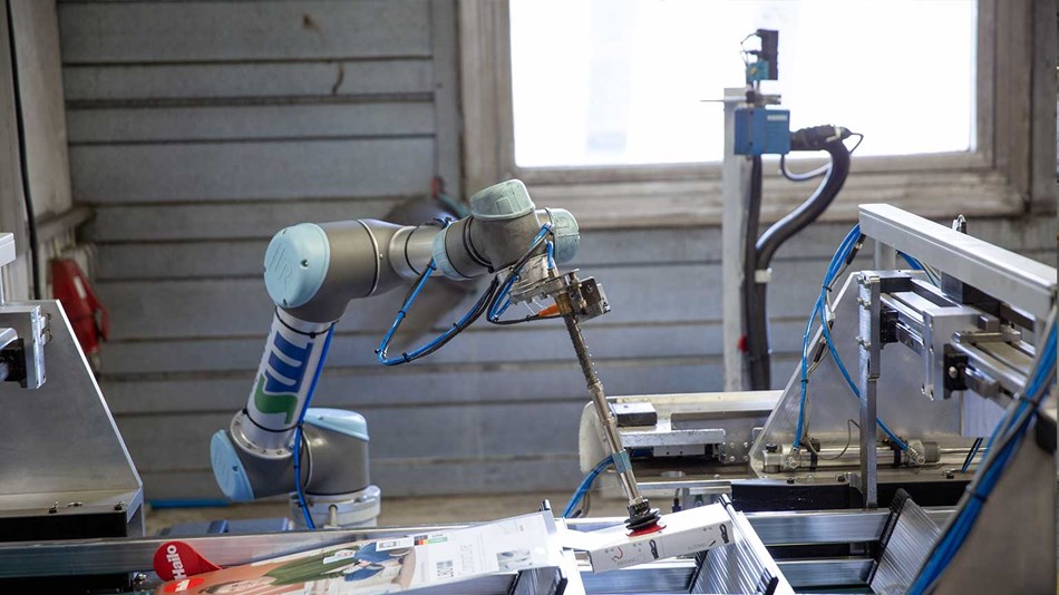 UR5直接位于傳送帶旁邊。一旦梯子在皮帶上接近,協(xié)作機(jī)器人就會(huì)用真空吸盤從雜志中撿起一本小冊子。它將其移動(dòng)到涂有粘合劑的熱膠槍上,最后在壓力下將其粘貼到梯子的其中一個(gè)臺(tái)階上。UR5還為其他型號(hào)的梯子配備了固定在梯子上的輔助紙箱。
