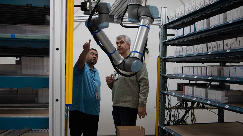 DCL Logistics將其自動化團隊派往南加州的ATX West貿易展,以研究機器人選項。任務是分析哪種機器人最適合DCL現有的成功工作流程,以及公司的環境,文化和未來計劃。自動化團隊計劃將機器人居中,以便它可以從兩個單元中挑選產品,一個在前面,一個在后面。UR10協作機器人的伸出距離超過1300毫米(51英寸),是滿足公司要求的少數機器人之一。
