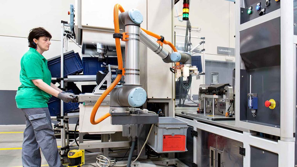 應用2:根據客戶的要求配置組裝單元,在配備單個操作員協同處理就足夠了。解決方案是添加一個優傲機器人,其功能是在焊接機和驗證機之間傳送零件。UR機器人等待,直到零件完成,將其從驗證機器中取出并在需要時將其直接送到操作員的手中。