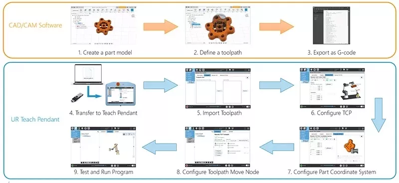 G代碼是CNC加工的行業標準語言,它會定義CNC機床中的電機如何移動、移動的速度以及遵循的路徑。機器人從根本上類似于CNC機器,因為它的每個關節也由電機驅動。我們只需要解析G代碼并相應地生成機器人命令,UR的開發團隊已經攻克了這一技術難點。我們之所以選擇G代碼,是因為CAD / CAM軟件廣泛支持G代碼。如果您已經在使用CAD / CAM軟件包,則無需購買或學習其他軟件。其他格式(如DXF)能夠定義路徑的幾何形狀,但它們不能包含用于機器人編程的所有必需信息,例如工具方向、速度和加速度。
