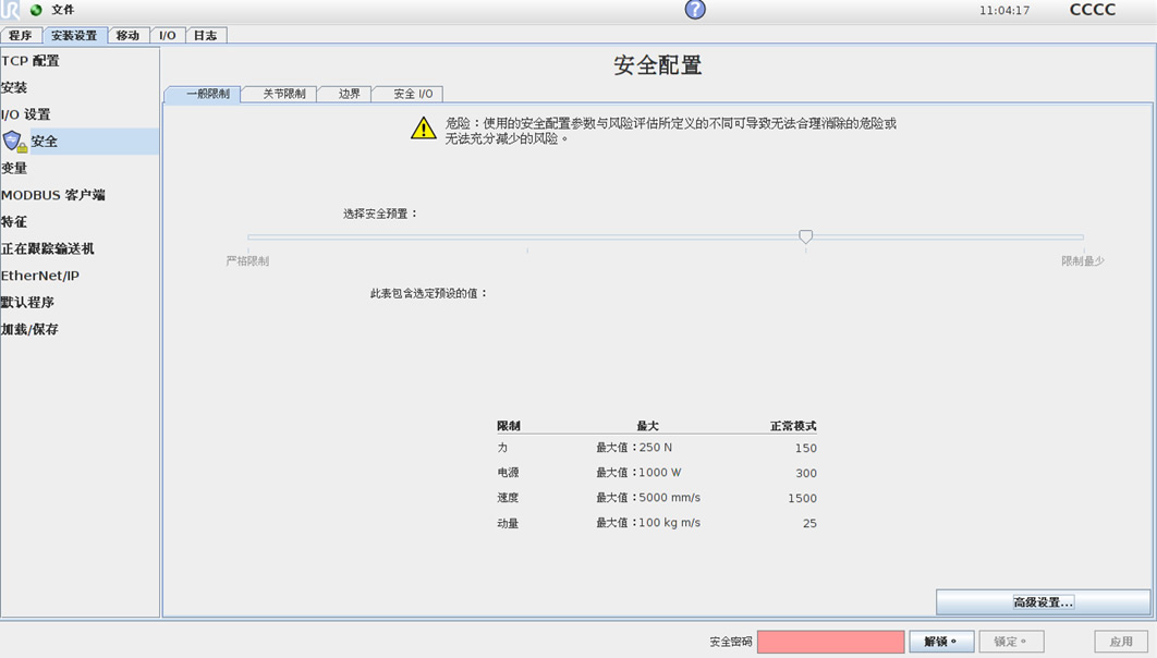 安全設置功能是UR機器人對于安全的基本設置。它共分為4個等級:嚴格限制、限制較少、一般限制、限制最少。每種限制都設定了機器人的力、功率、速度、動量4種參數的最大值和最小值。在機器人運動中一旦有指標超出參數設定值,機器人就會保護性停止,達到安全的目的。為了適應使用者靈活的要求,在設定安全等級后,還可以進入高級設置頁面對于每個數值進行個性化修改。