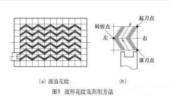 波浪花紋如圖5a所示。刮花前要在工件表面用鉛筆劃出一定間距的方格。刮花時(shí),刀身平面中心線要平行于工件表面縱向中心線,從工件的后面向前面進(jìn)行刮削。基本刮法是:采用豁口刮刀進(jìn)行刮削,選擇好落刀位置(一般選擇交點(diǎn)處),落刀后即向左側(cè)斜向移動(dòng)推刮,當(dāng)達(dá)到一定長(zhǎng)度時(shí)(一般選擇交點(diǎn)處)緊接著向右側(cè)斜向移動(dòng)推刮至一定位置后起刀,如圖5b所示。