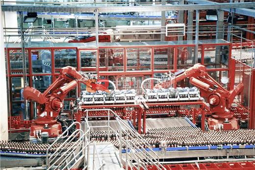 “生產線上的六臺abb翻新機器人IRB6400是最初應用于汽車工業的橙色工業機器人。其中有四臺機器人負責開啟空瓶,另外兩臺則利用拾放程序將啤酒裝進入塑料箱。這些機器人能夠從各種回收瓶中挑出自己品牌的瓶子。”