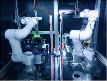 兩臺EC63桌面式協作機器人及顯揚科技的3D視覺設備應用于末端檢測工位,左側機器人執 行按鍵檢測,右側機器人負責觸摸屏的觸控檢測,顯揚科技的3D視覺設備拍攝被測物體,滿足客戶對X、Y、Z方向測量或定位等高分辨率畫面輸出的需求。協作機器人特別 適合狹小空間自動化改造,符合曲面屏或雙面屏檢測要求。
